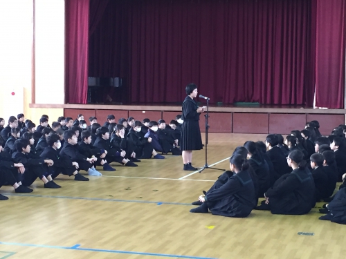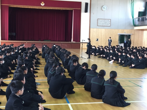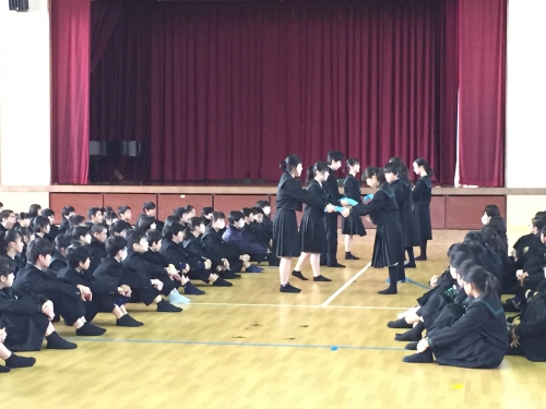 4月9日(火)、昨日入学した1年生と2・3年生の対面式が行われました。新入生代表の前出さんから「小学校6年間で学んだことを活かし、やる気と元気で勉強やクラブ活動、仲間づくりに精一杯頑張っていきます」とやる気溢れる挨拶がありました。生徒会を代表して刀根さんから「中学校3年間でたくさんの人とたくさんの経験をし、充実した日々を送ってください。不安になることがあっても2・3年生が助けてくれるので、目標に向かって楽しい学校生活にしていきましょう」と先輩として頼もしい挨拶がありました。そして、生徒会より1年生各クラスに記念品が贈呈されました。
