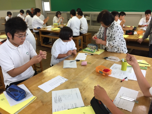2年生の家庭科の授業で松阪木綿を用いてブックカバーを製作します。その準備として今、学習支援ボランティアの方々に支援をしていただきながら、縫い方の練習をしています。支援していただいているおかげで、順調にたまどめやなみぬい等をマスターしています。どのようなブックカバーが出来上がるか楽しみです。