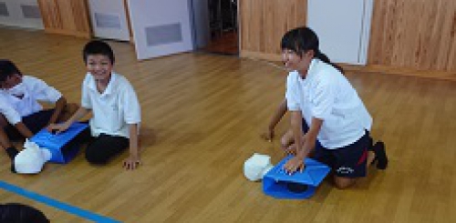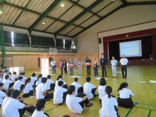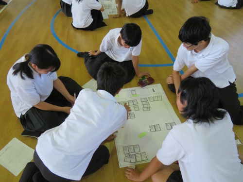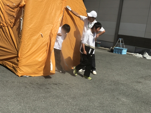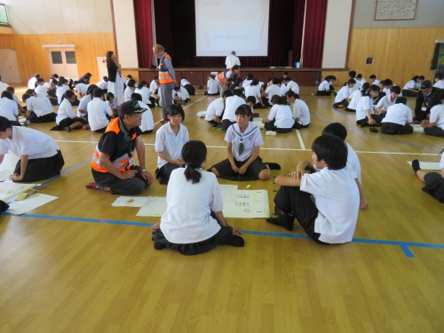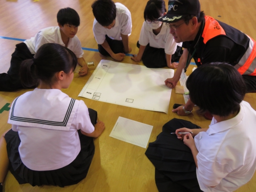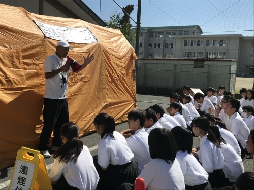 9月19日、みえ防災減災センターや松阪防災訓練センターの方々にお越しいただき、学年別の防災訓練行いました。1年生は地震体験・濃煙体験、2年生は応急手当訓練(心肺蘇生法)・搬送訓練、3年生は避難所運営図上訓練を行いました。災害時に安全に避難する方法や救助の方法、避難所運営について学びました。