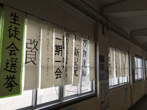ホーム > 学校活動の様子 / 2019年度 後期生徒会役員候補者スローガン 9月26日に行われる後期生徒会役員立会演説会と選挙に向けて、立候補者のみなさんのそれぞれの熱い思いを込めたスローガンを職員室前廊下に掲示しました。スローガンを見ると、立会演説会でどのような演説をしてくれるのかがとても楽しみです。 シェアする Twitter でシェア はてなブックマークに保存 LINE でシェア Facebook でシェア Pocket に保存 Feedly で購読 関連投稿 学校活動の様子 / 3年 / 2019年度 わくわくワーク2日目 学校活動の様子 / 2019年度 文化祭 その7 2024年度 / 学校活動の様子 / 3年 第77回卒業証書授与式が行われました 学校活動の様子 / 2019年度 体育祭に向けて 学校活動の様子 / 2020年度 彩り豊かなプランター完成 ~美術部~ 学校活動の様子 / 2019年度 ESS(English Speaking Society)の活動 前の投稿 美術部の活動~廊下の壁画~ 次の投稿 防災訓練