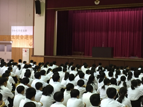 9月26日後期生徒会役員を選出するための演説会と選挙がおこなわれました。候補者のみなさんは「鎌中がより良くなるために!」という思いで演説をしていました。聴いている生徒のみなさんも、その思いを受け止め、演説が終わったら精一杯の拍手で応えていました。写真の中には、演説会を運営したり開票したりする選挙管理委員のみなさんの様子も掲載しました。ありがとうございました。鎌田中学校が力強く前進するたくましさを感じる演説会でした。