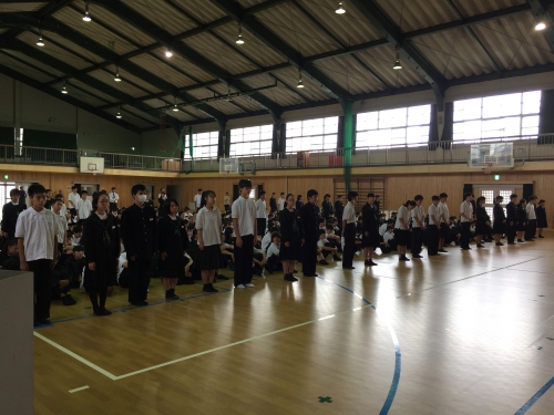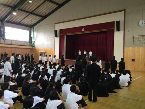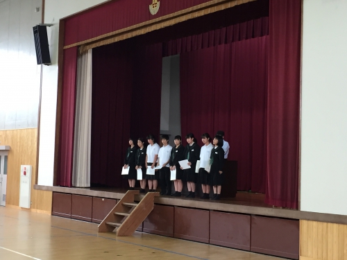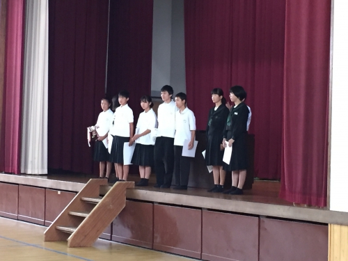 10月11日(金)2019年度前期終業式、表彰伝達、後期生徒会役員・学級役員の認証式が行われました。終業式では校長先生から「やろうと思ったことは、今から行動しよう。そして何事にも全力で取り組もう」とお言葉をいただきました。生徒指導の大西先生からは「お互いに注意し合える人になろう」とお話していただきました。表彰伝達では、9月に行われた松阪地区中学校新人体育大会や夏休みの課題等で活躍したみなさんが表彰されました。また、認証式では役員のみなさんの大きな返事に、鎌田中学校の代表として、責任を持って役割を担っていこうという意気込みが感じられました。生徒のみなさん全員でより良い学校にしていきましょう。