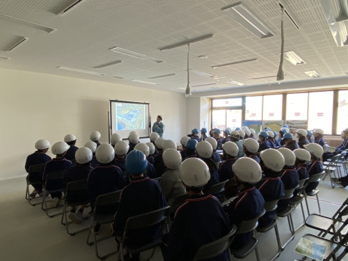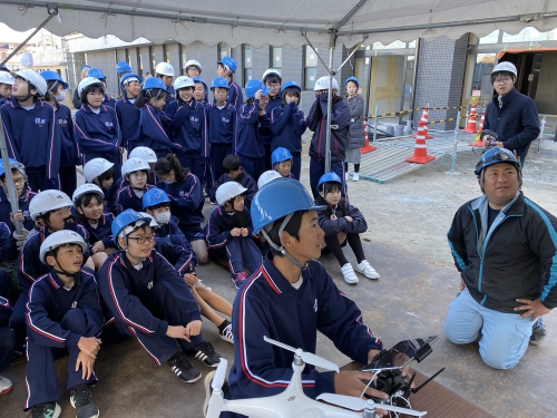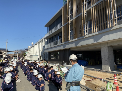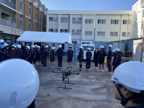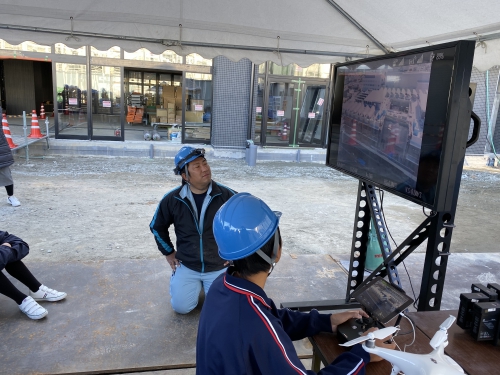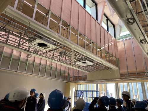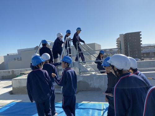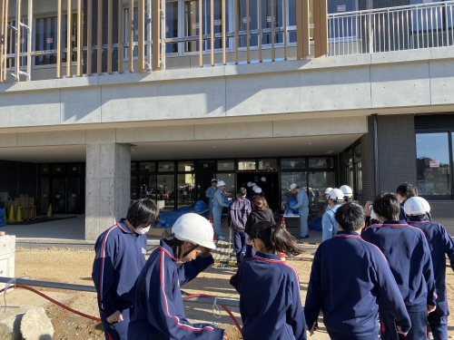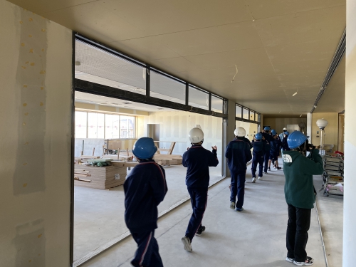 11月15日、建設途中の新校舎を見学させていただきました。工事の概要の説明後、新校舎内を1階から屋上まで見学しました。ドローンを飛ばして撮影した上空からの新校舎風景も大型モニターで見せてもらいました。実際に子どもたちがドローンの操作もするなど、楽しみながら見学できました。新校舎の完成が待ち遠しいです。