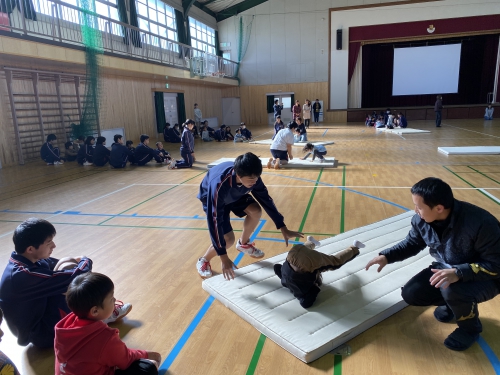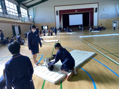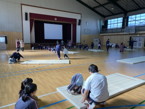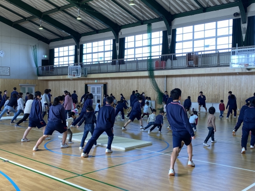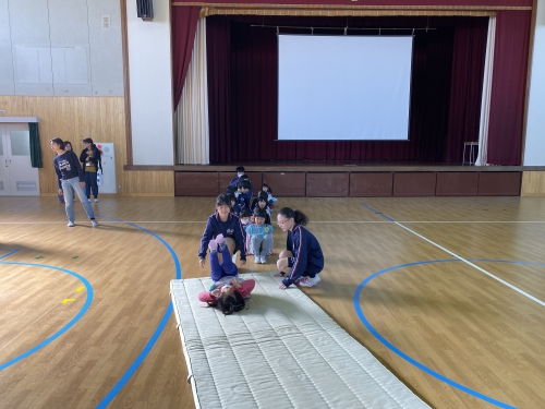 11月21日、鎌田幼稚園、港幼稚園、三郷保育園の園児と本校3年生が体育の授業で交流しました。園児と3年生のペアで自己紹介をした後、一緒に準備体操、ランニングをしました。その後、園児がマット運動の前転・後転をするのを3年生がサポートしました。園児を優しく見守る姿やさりげなく手をさしのべる姿、声をかけて応援する姿など温かな雰囲気のもと交流ができました。園児から楽しかった、また一緒にしたいという声があがっていました。