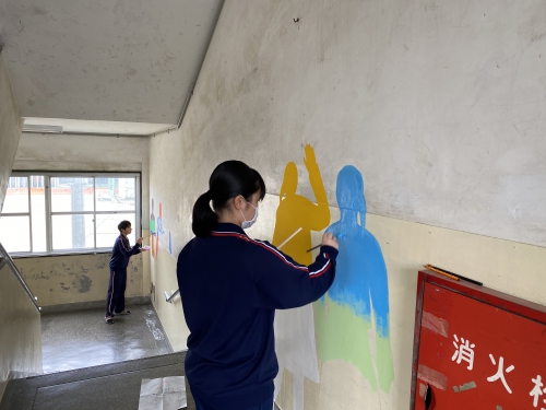 3年生は美術の授業で「私の記憶」というテーマで3年間の出来事や思い出を自分の人型の中にデザインし、廊下や階段の壁面に描いています。4月には取り壊しとなる校舎にこれまでの想いを込めて一筆一筆丁寧に描いています。3月28日(土)29日(日)の旧校舎お別れ会にお越しいただき、是非3年生の作品をご覧下さい。