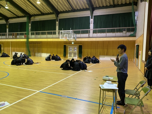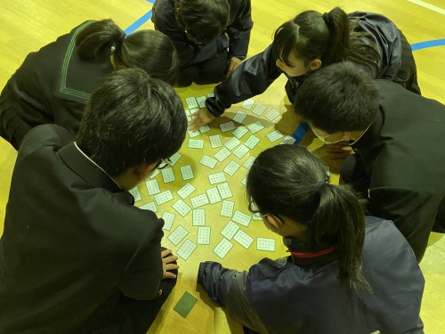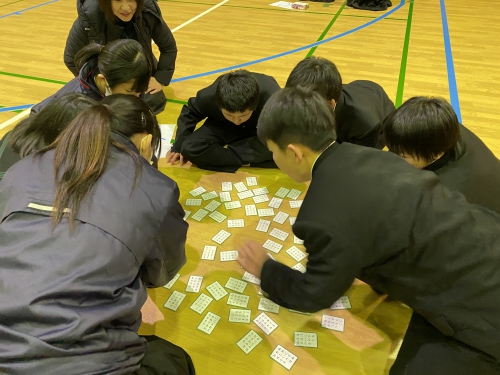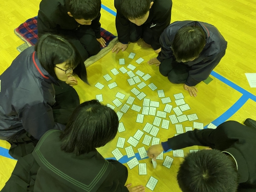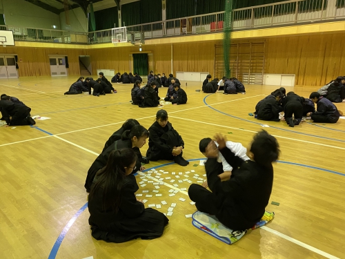 1月27日(月)5・6限目に、1年生の百人一首大会がクラス対抗で行われました。読み手の先生が札を読み始めると体育館はシーンとなり、下の句が読まれると、迫力ある取り合いになりました。真剣勝負の中に、日本の伝統である百人一首を楽しむ笑顔があり、第一学年の温かな雰囲気を感じました。優勝はB組、準優勝はD組でした。