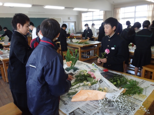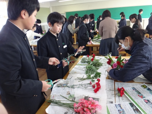 ホーム > 1年 / 学校活動の様子 / 2019年度 花育体験教室 2月26日、三重県中央農業改良普及センターの石山さん、櫻井さん、森本バラ園の森本さんにお越しいただき、1年C・D組で花育体験教室を行いました。卒業式の式場に飾るフラワーアレンジメントを心を込めて作りました。明日27日はA・B組で行います。 シェアする Twitter でシェア はてなブックマークに保存 LINE でシェア Facebook でシェア Pocket に保存 Feedly で購読 関連投稿 1年 / 学校活動の様子 / 2019年度 社会見学② 1年 / 2024年度 / 学校活動の様子 1年校外学習 D組 鈴鹿市河川防災センターに行きました! コミュニティ・スクール / 学校活動の様子 / 2023年度 大掃除を行いました! 1年 / 学校活動の様子 / 2020年度 1年防災訓練 学校活動の様子 / 2019年度 イングリッシュキャンプ 学校活動の様子 / 2020年度 松阪地区中学校新人体育大会 ~男子卓球の部~ 前の投稿 卒業式に向けてのハンギングバスケット制作 次の投稿 卒業式について