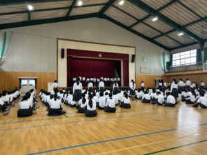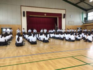 生徒指導担当の先生からは、「後期は自分を変えられる、やり直せるチャンスの節目。『後期に頑張りたい』という前向きな声を聞くこともあり嬉しい。問題行動は自分や周りの仲間のために何のプラスにもならない。後期、自分の目標や進路の実現に向けてプラスになる行動を増やしていこう。」という話がありました。