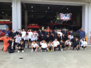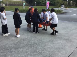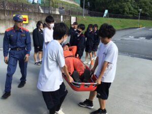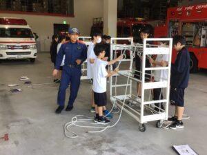 レスキュー体験では、緊急車両の見学や担架とロープの使用方法の体験をさせていただきました。