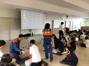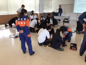 応急手当法では、胸骨圧迫やAEDの使用方法の練習をさせていただきました。