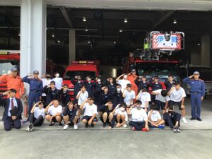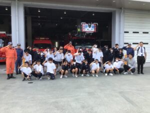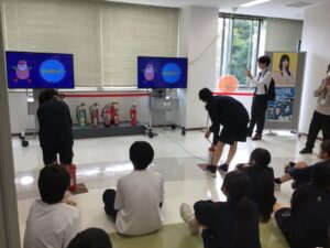 また、南海トラフ地震が起こった際に予想される津波の映像を見せていただいたり、火災発生時の初期消火と煙体験をさせていただいたりしました。