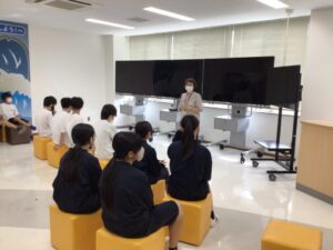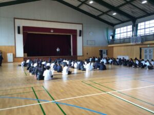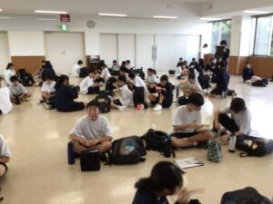 最初に出発式を行い、学年主任の荒木先生と生徒指導担当の土谷先生から、改めて校外学習の目的や守るべき約束事の確認について話がありました。