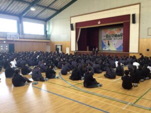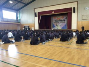体育館では、2年生級長会から「き•あ•い 緊迫感をもって 安全に 命を繋ごう」という意図で、2段階の避難や予告なく避難経路を制限したこと、避難の様子を見た感想等について話がありました。